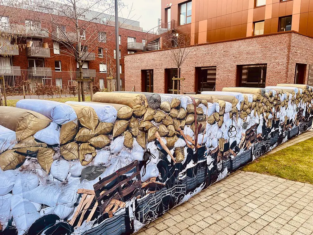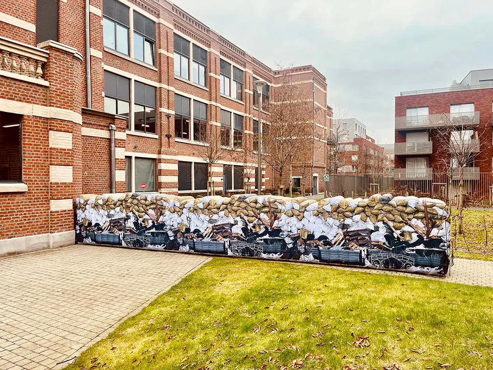 Ce long mur est la réplique exacte d’une vraie barricade fabriquée à partir d’une toile textile polyester résistante. A longue distance, elle trompe l’ennemi.