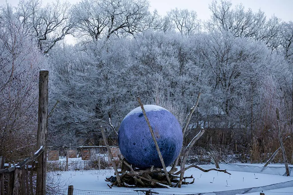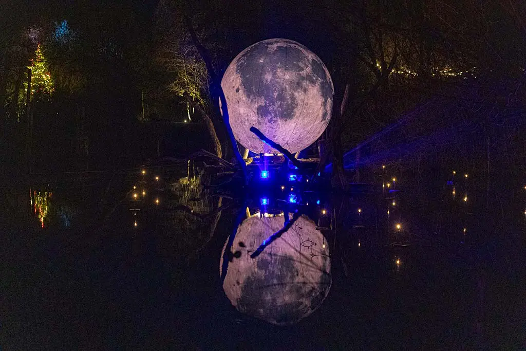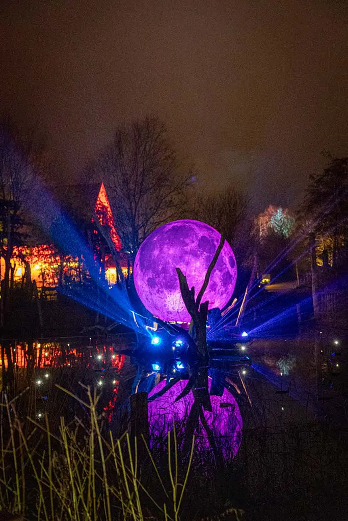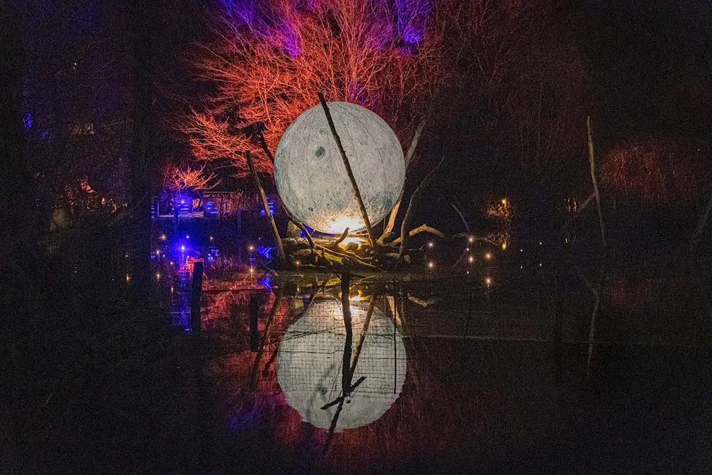 Une quête hivernale s’organise au parc animalier Sainte-Croix : sur le parcours une lune gonflable éclairée se réverbère sur l’eau…