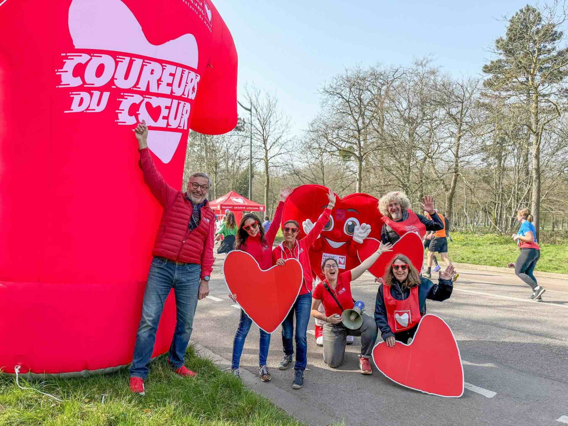 Mécénat Chirurgie Cardiaque sensibilise avec un maillot gonflable Coureurs du Coeur sur le semi-marathon de Paris