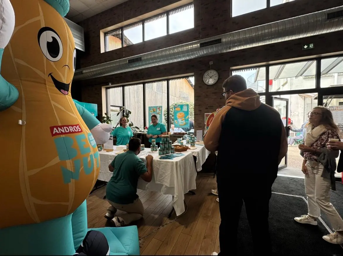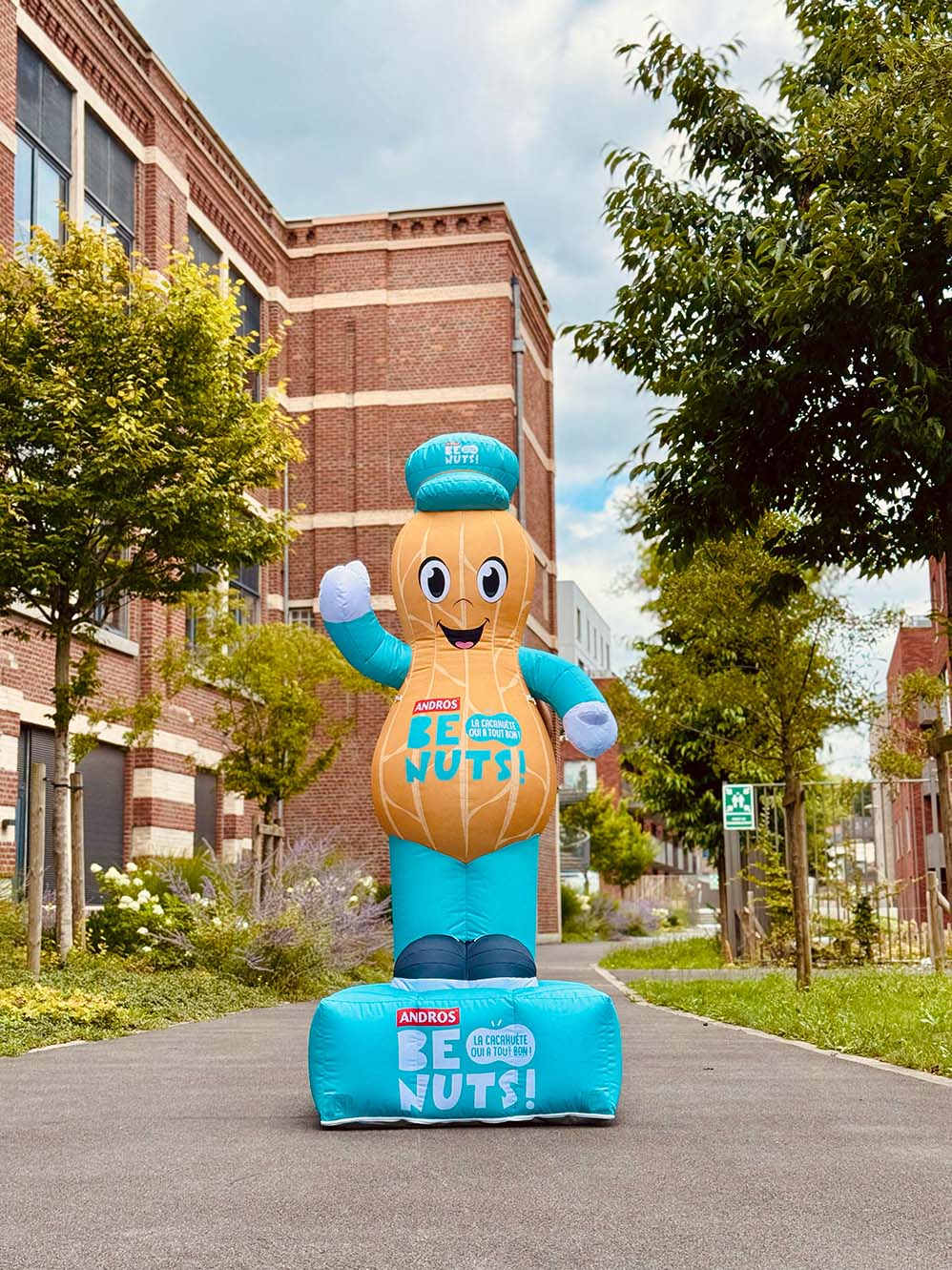 La mascotte gonflable est notamment utilisée à l’occasion de la Journée de la Cacahouète le 13 septembre 2025 au siège d’Andros pour un moment convivial et gourmand en équipe.