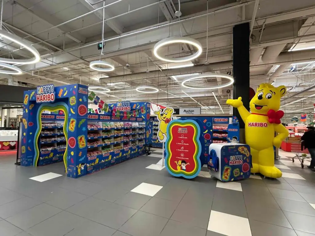 En 2026, nous fabriquons une nouvelle mascotte gonflable HARIBO de 3 m (H) qui est utilisée en grande distribution dans le cadre d’une animation commerciale.