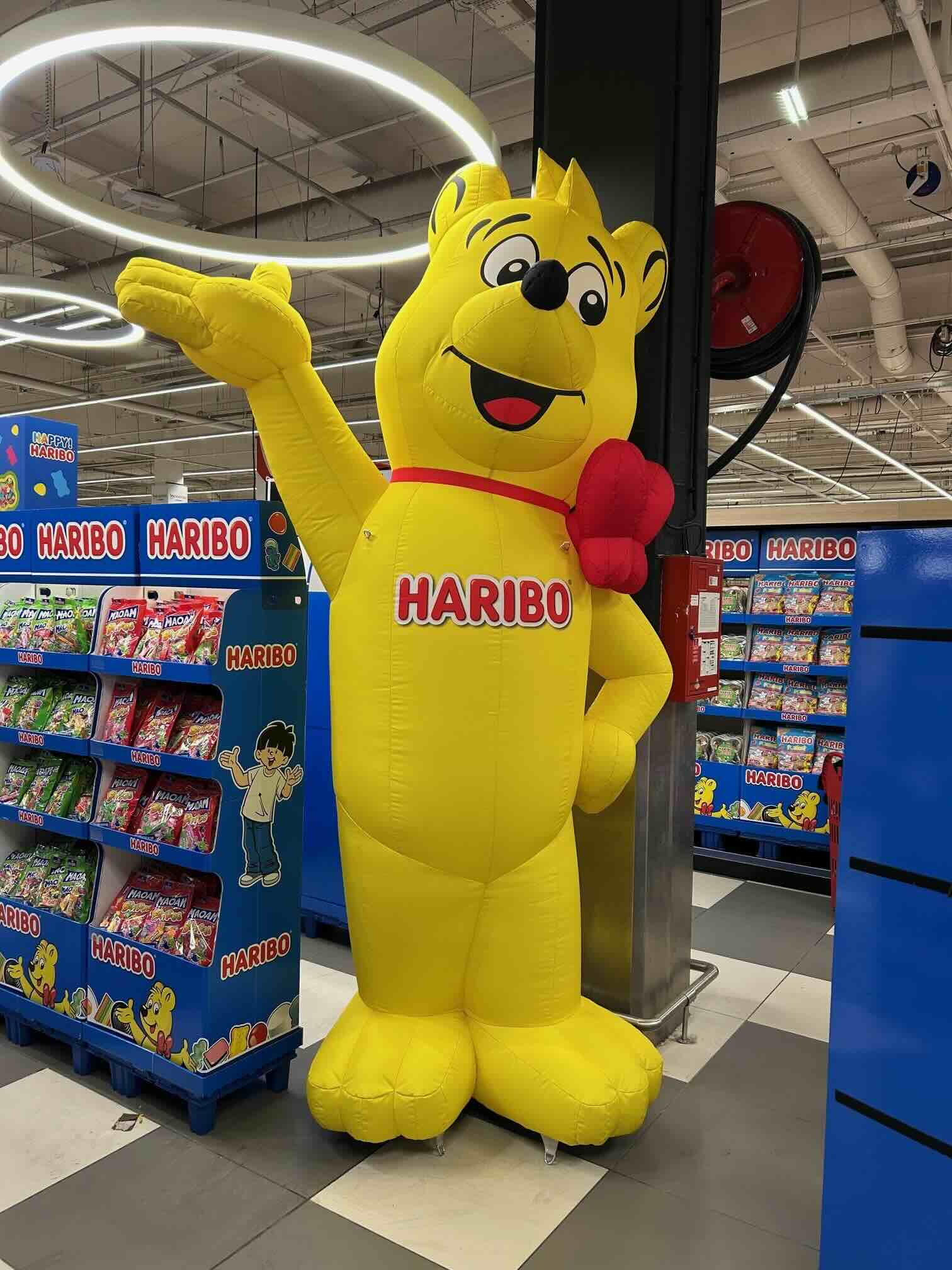 En 2026, nous fabriquons une nouvelle mascotte gonflable HARIBO de 3 m (H) qui est utilisée en grande distribution.