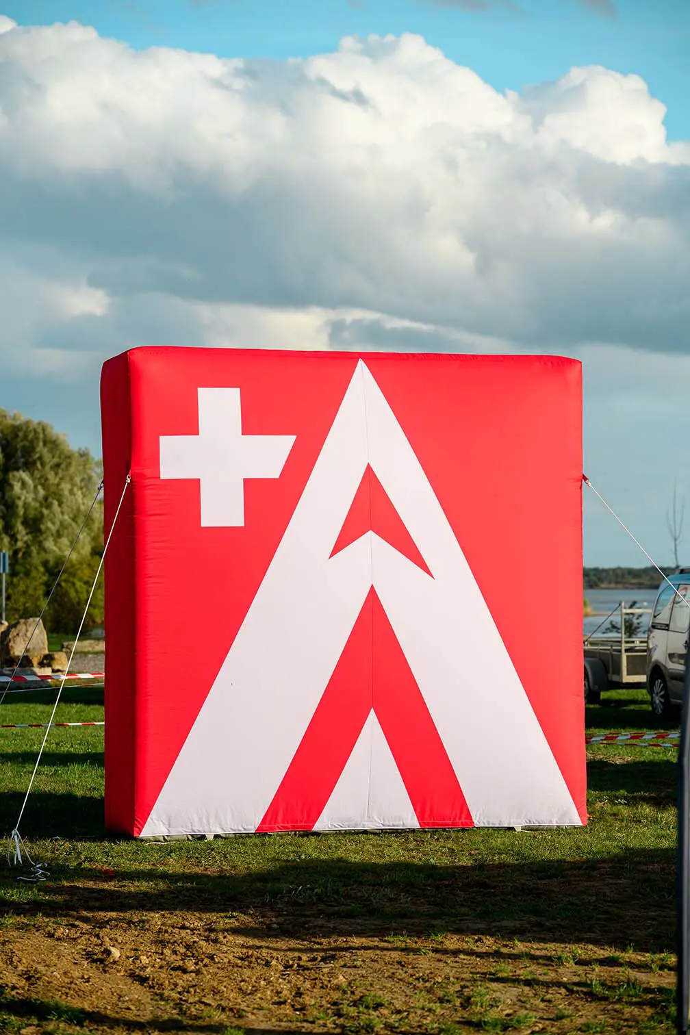 En tant que partenaire titre, Swisskings déploye une communication significative auprès des visiteurs appuyée par ce mur gonflable rouge de 3 m x 3 m visible à plusieurs mètres.