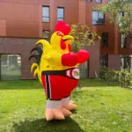 Ainsi, nous fabriquons le poulet gonflable Dédé en 3 m (H) personnalisé comme souhaite le client, habillé en boxeur.