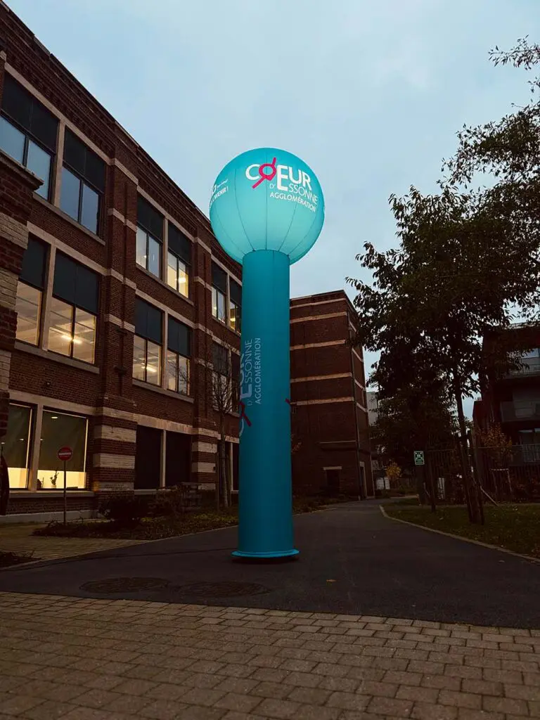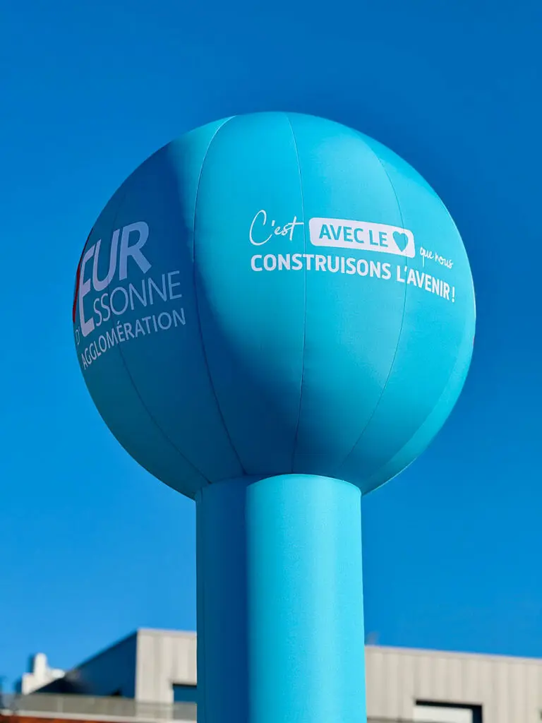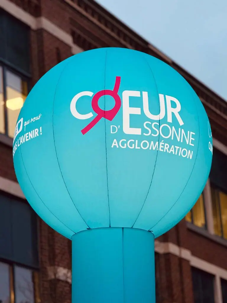 Le totem gonflable Coeur d’Essonne est intégralement personnalisé aux couleurs de l’agglomération. Pour optimiser la visibilité, une LED est intégrée dans la sphère.